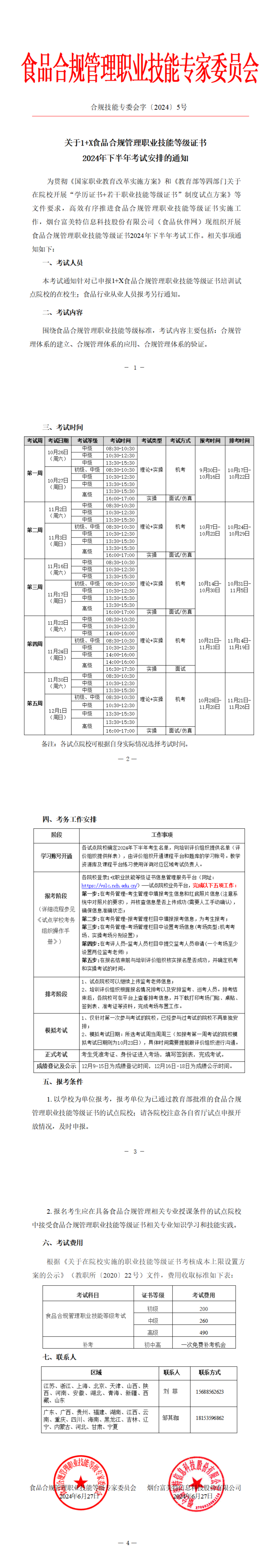 关于1+X食品合规管理职业技能等级证书2024年下半年考试安排的通知