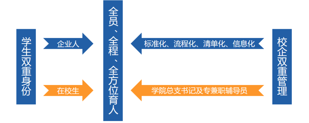 学生双重身份,即是在校生又是企业人;校企双重管理,企业按照标准化、流程化、清单化、信息化的要求,学院总支书记及专兼职辅导员,达到全员、全程、全方位育人的效果。