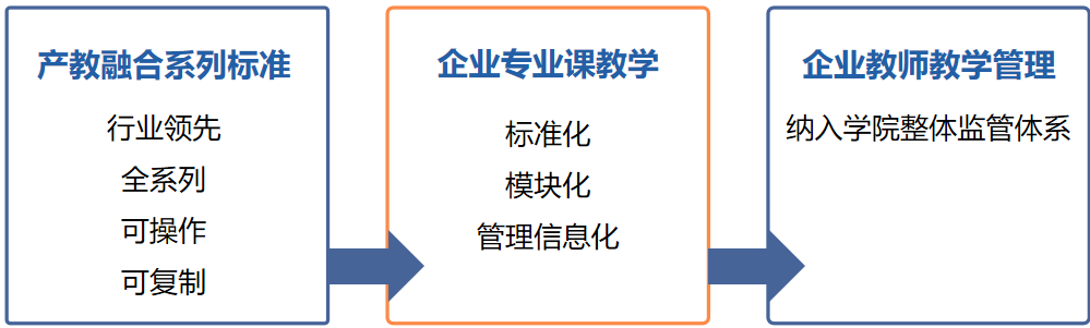 产业、项目、专业、课程四维度贯彻产教融合系列标准,企业专业课教学要求标准化、模块化、管理信息化,企业教师教学管理纳入学院整体监管体系。