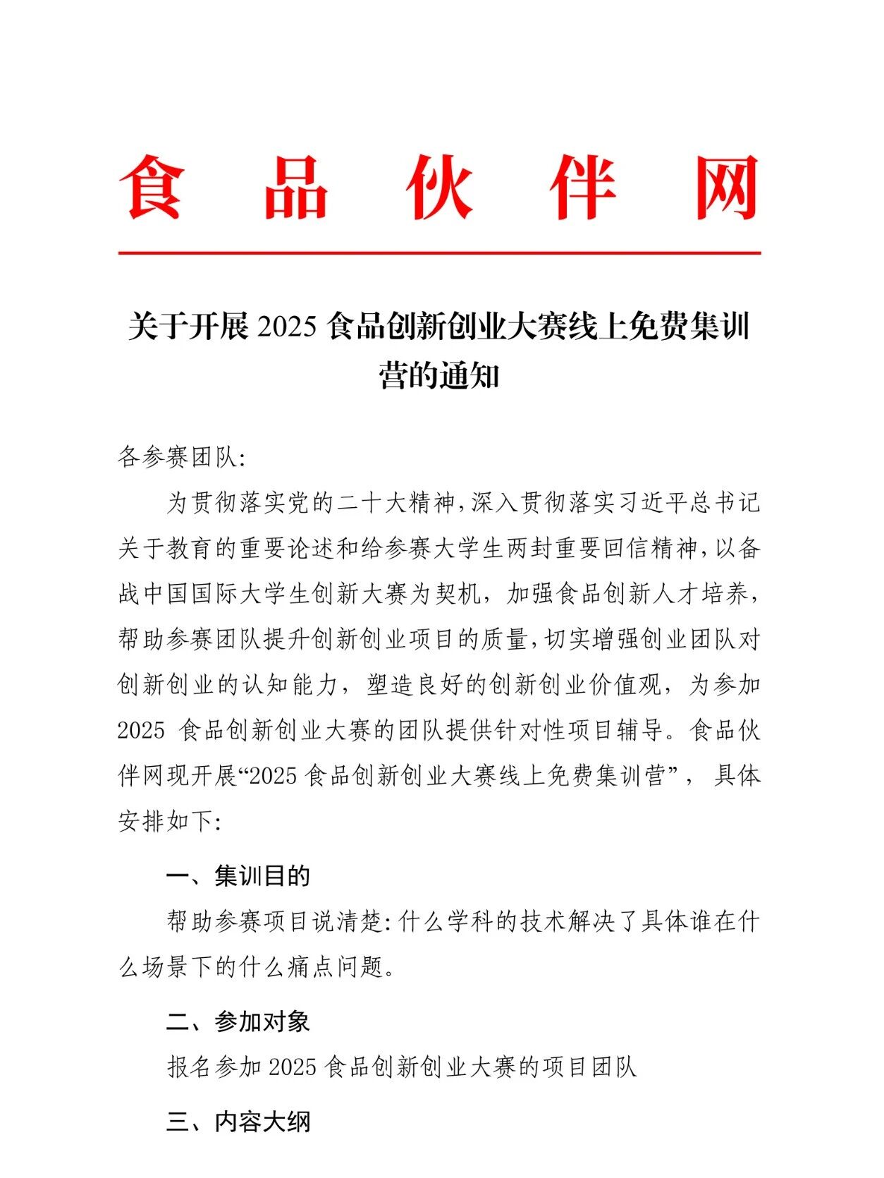 关于开展2025食品创新创业大赛线上免费集训营的通知