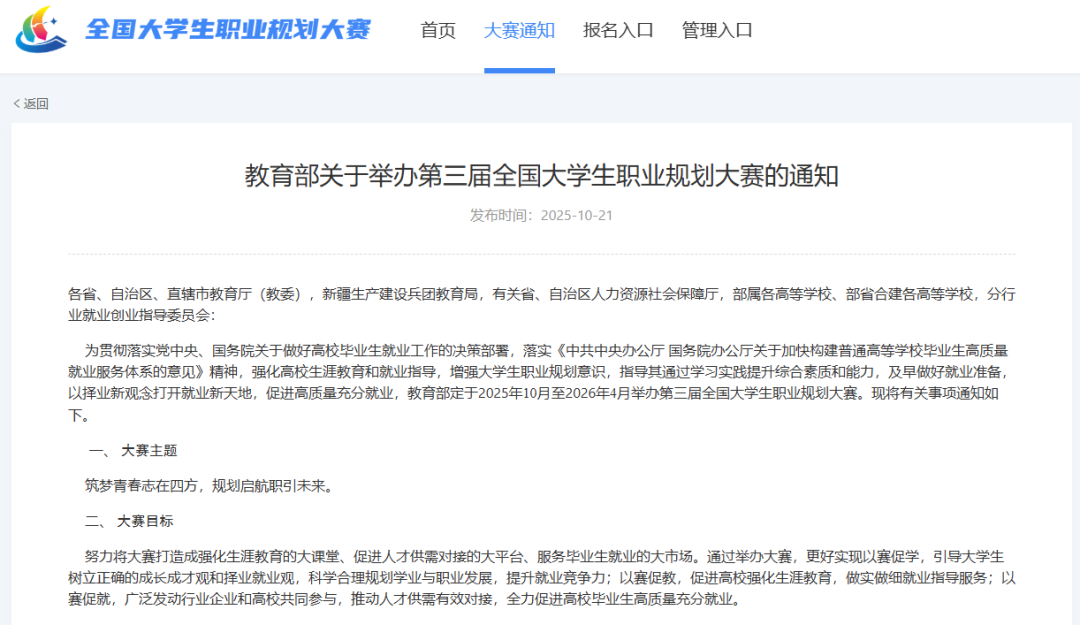 第三届全国大学生职业规划大赛通知链接:https://zgs.chsi.com.cn/notice/120?type=1